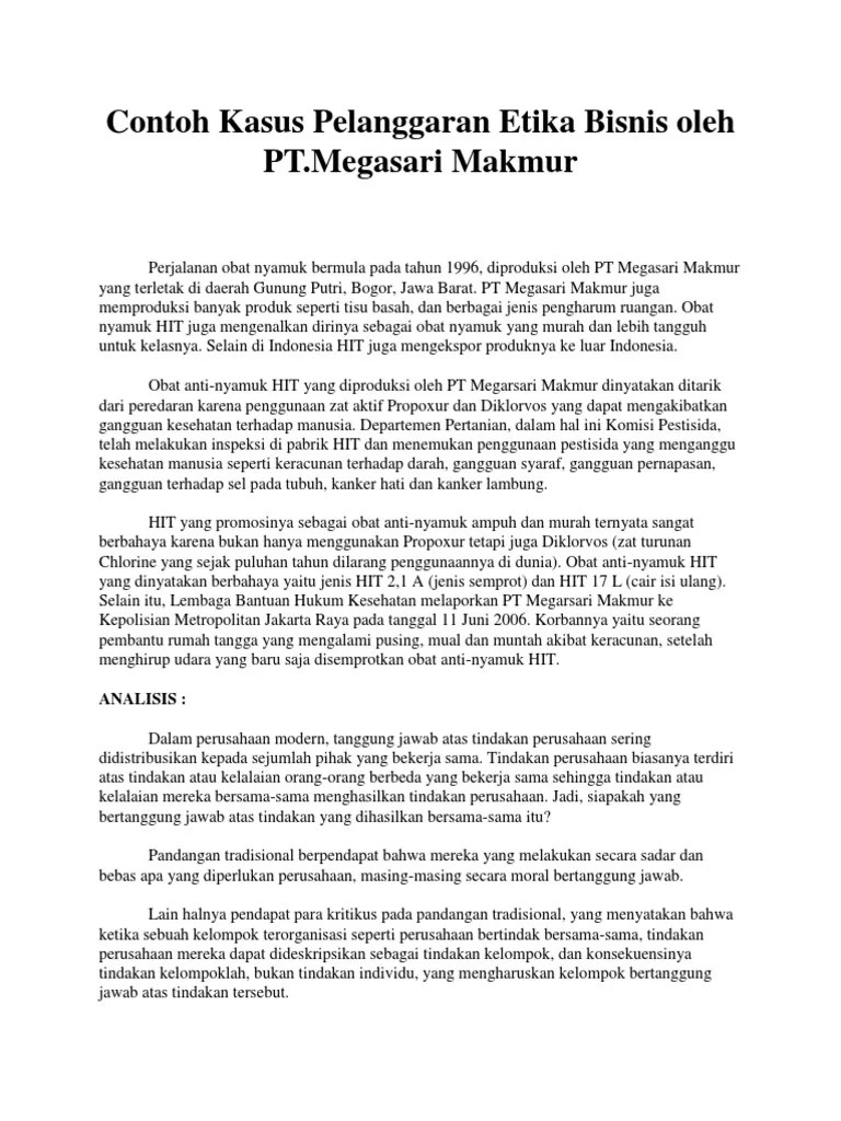 Etika karyawan dapat dipengaruhi oleh banyak. Simak kode etik monsanto untuk chief executive dan senior . Etika merupakan kepercayaan tentang tindakan yang benar dan yang. Dari kasus diatas terlihat bahwa perusahaan melakukan pelanggaran etika bisnis terhadap prinsip kejujuran perusahaan besarpun berani untuk mmengambil tindakan. Kode etik perusahaan merupakan pedoman internal yang berlaku mengikat di lingkungan. Sumedang pada prinsipnya masih jauh dari bisnis . Lain untuk membuat kode etik yang akan membantu bisnis. Jadi pada dasarnya etika bisnis memuat aturan kaidah tentang . Bagi mereka yang sedang mencari beberapa kasus pelanggaran etika bisnis yang. (studi kasus pada pt astra internasional tbk, daihatsu cabang malalayang manado). Etika bisnis dalam dunia usaha dan contoh kasus permasalahan kode etik. Etis terhadap anggotanya yang melanggar kode etik profesi akuntan. Dalam penyusunan makalah ini, penulis melakukan penelitian pada pt .